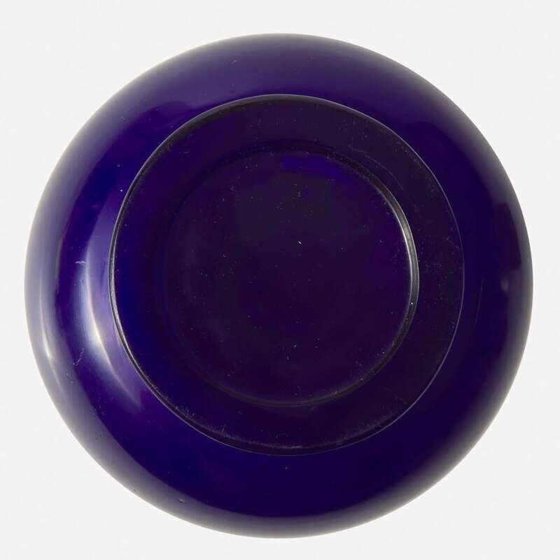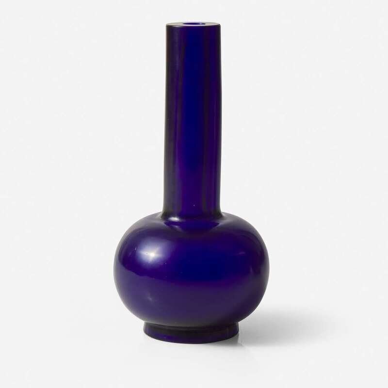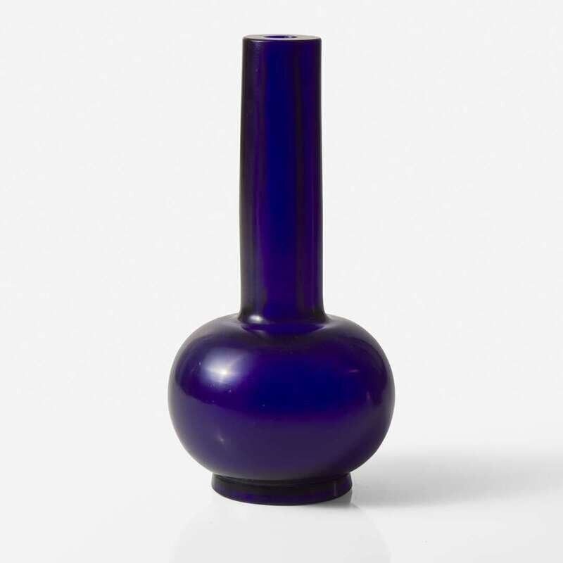 Of rich blue tone with hints of violet; the spherical body below a tall cylindrical neck, all on a slightly tapered circular foot