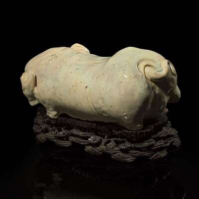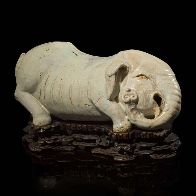 The recumbent elephant with thick "moon-white" glaze, pooling to blue, on a stained wood stand carved with pine, lingzhi and rockwork