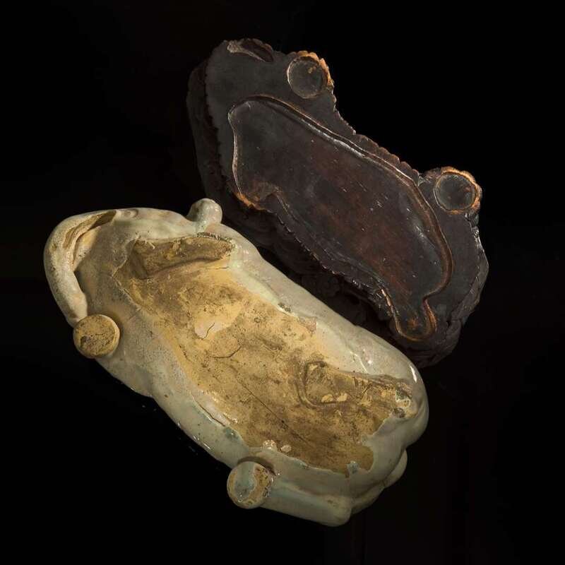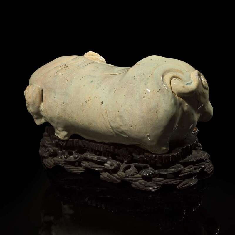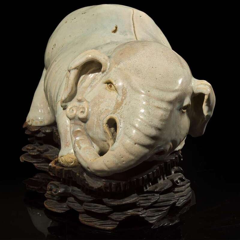 An unusual Chinese elephant-form white-glazed stoneware pillow and carved wood base 白象瓷枕與木座