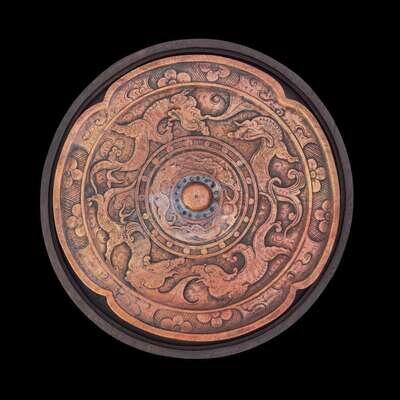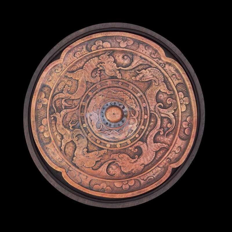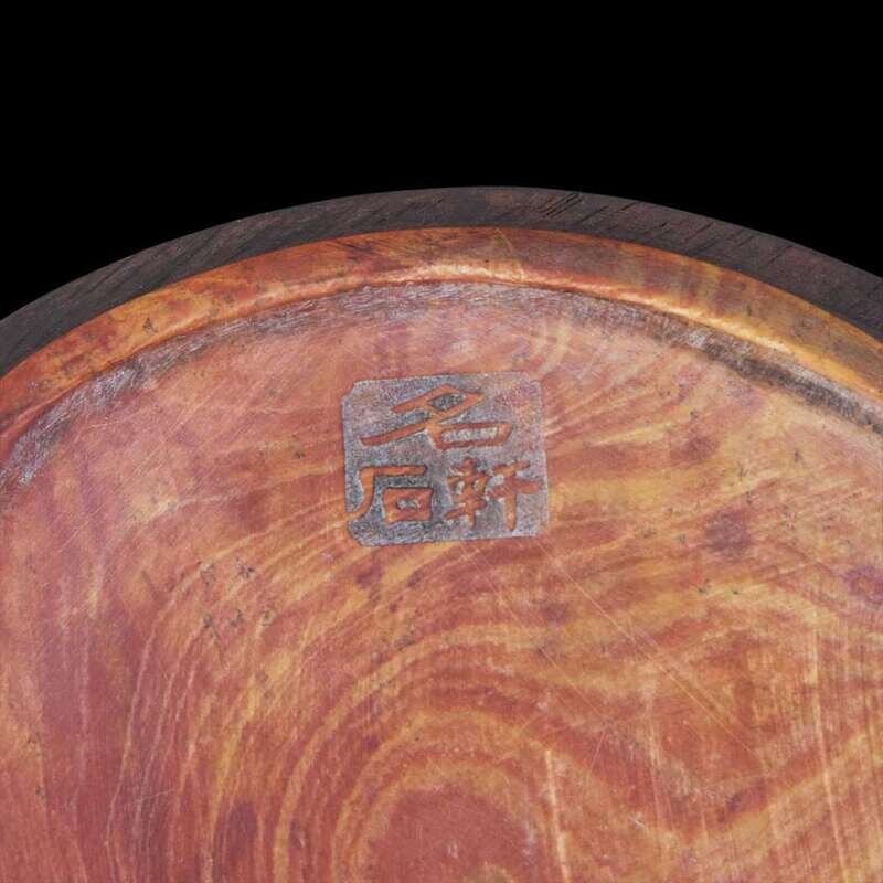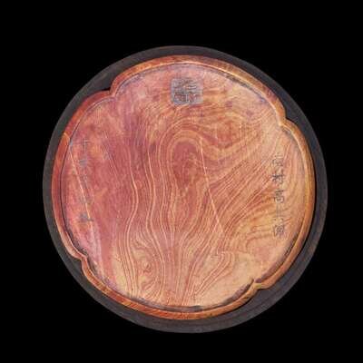 Carved in the form of an archaic bronze mirror, the stone of striated brick red and yellow, the "back" with motifs of sinuous dragons and floral bands, centered by a knop, the face of the inkstone bears a signature "Nancun Gao Qipei", left inscribed "Dinghai nian chu dong" (early winter of 1704), inscribed ''Ming shi xuan" mark to the top, with wood base and cover, possibly zitan.