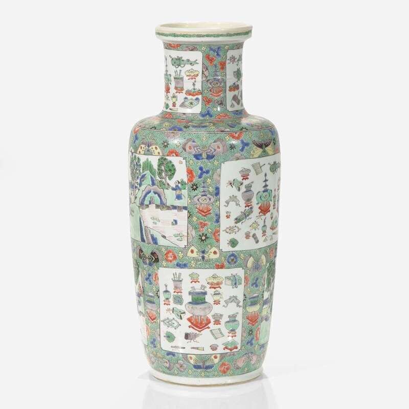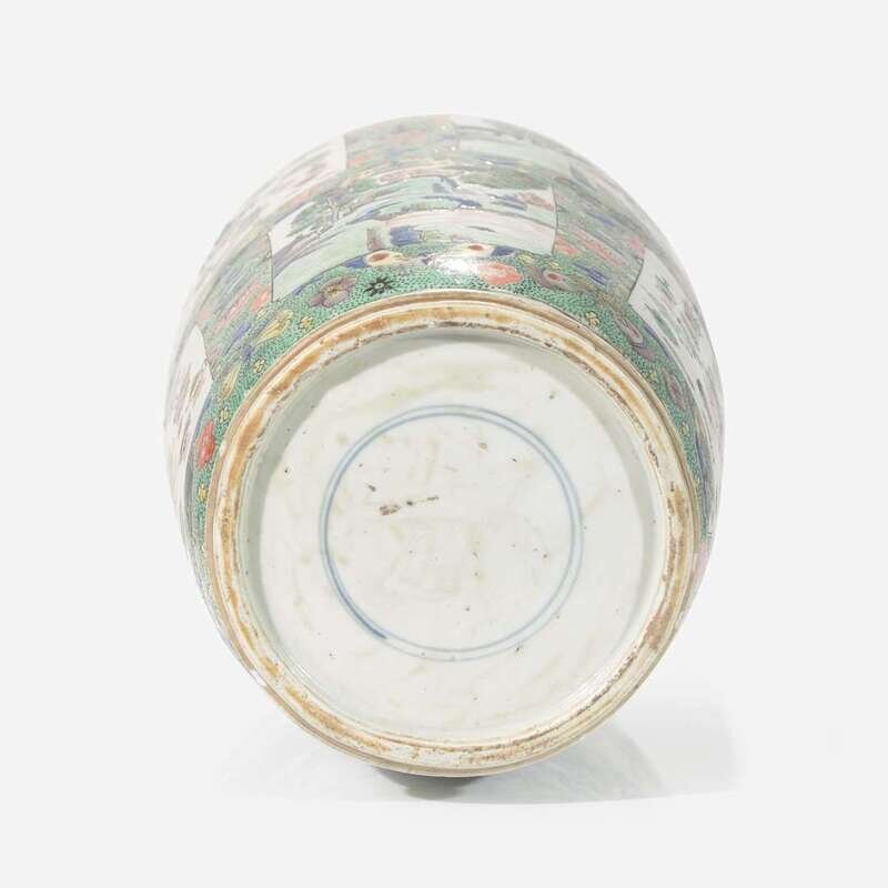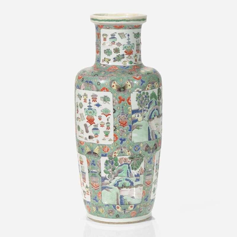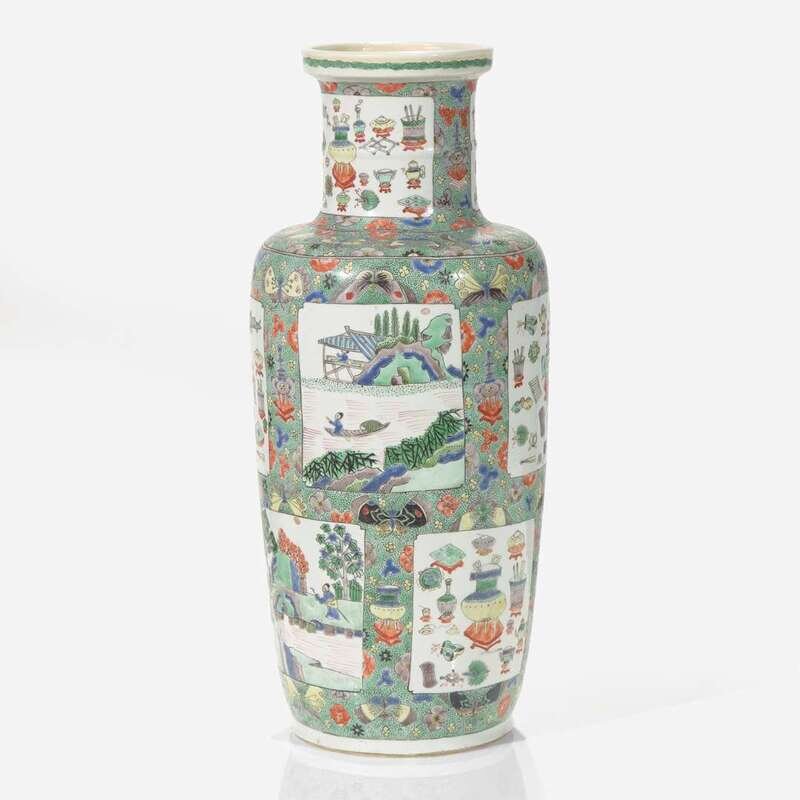 Decorated with rectangular panels of landscapes and "antiques", against a speckled green ground with antiques and butterflies
