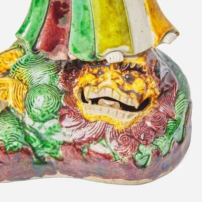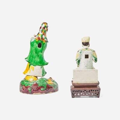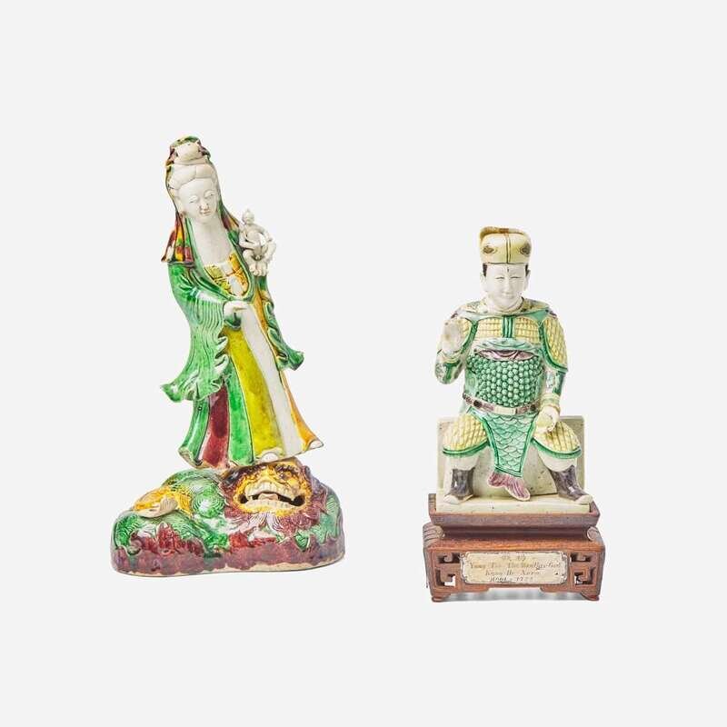 Comprising a Guanyin holding tongzi, raised above a fish-form mythical beast stand, decorated in green, yellow, and aubergine; the second depicting the seated warrior figure Yang Jian in unusual fish form military uniform, painted in green, yellow, purple, and black, holding a pyramid-shaped chisel in one hand, mounted to wood base with engraved western plaque.
