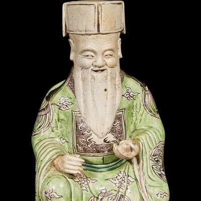 Depicting the deity holding an ingot in his hand, in official hat and uniform, his face and both hands carefully modeled and unglazed.