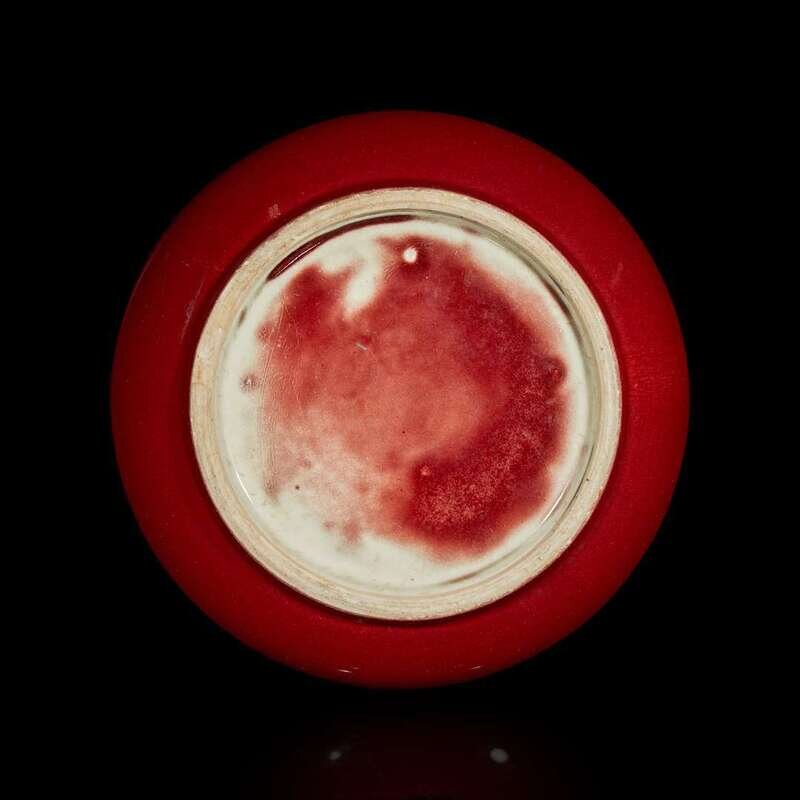 Of wide bulbous form, exterior with a dense rich glaze, interior glaze with pale green tint and areas of red