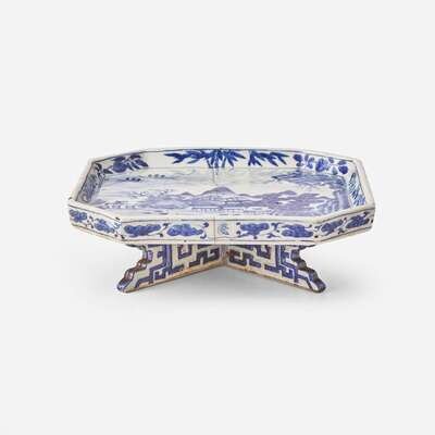 The dish with apocryphal six-character Chenghua mark to the underside; the octagonal stand decorated with a river landscape, all raised on an unusual cross-form base molded and decorated with archaistic kuei dragon scrolls, four character Jiaqing mark to the rim and of the period (minyao)