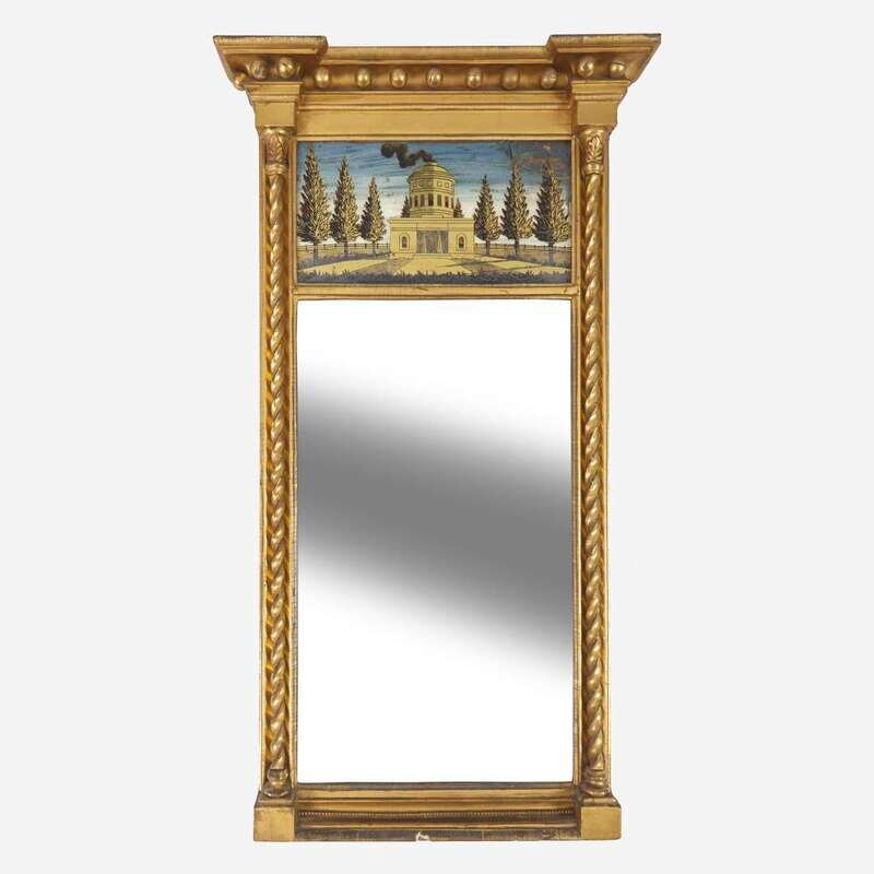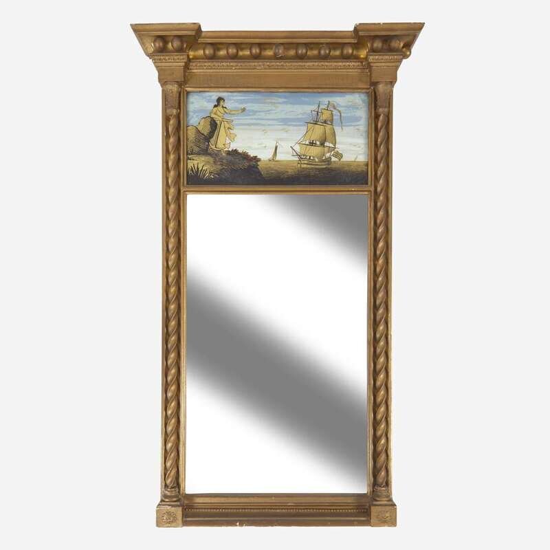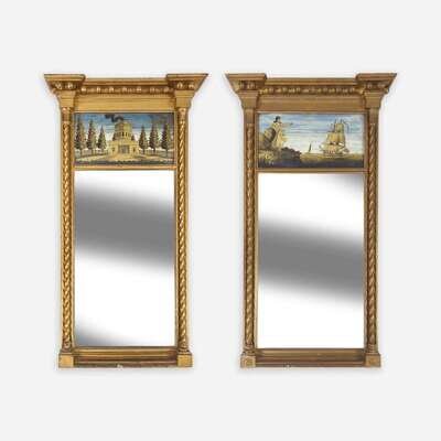 Both of similar form, with stepped cornice hung with spherules above églomisé panels, the first with panel depicting Benjamin Latrobe's Pump House in Philadelphia, Pennsylvania, and the other depicting figure of hope and a ship at sea, the panels above mirror plates flanked by spiral-turned columnettes.