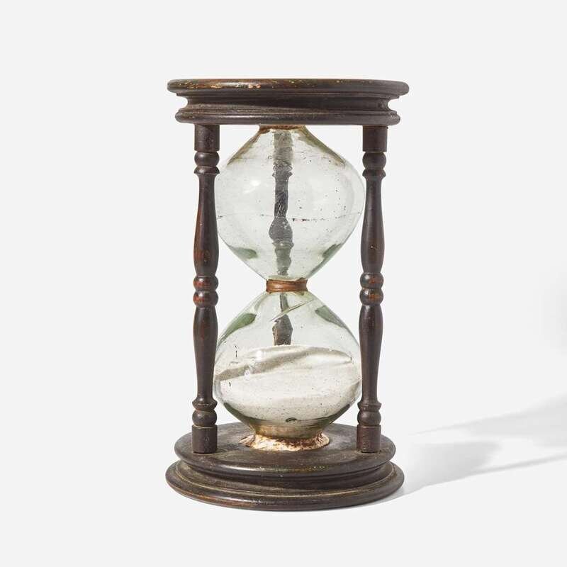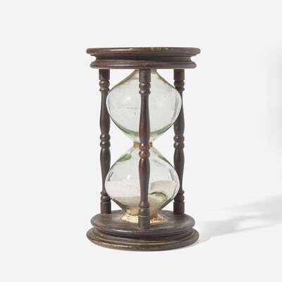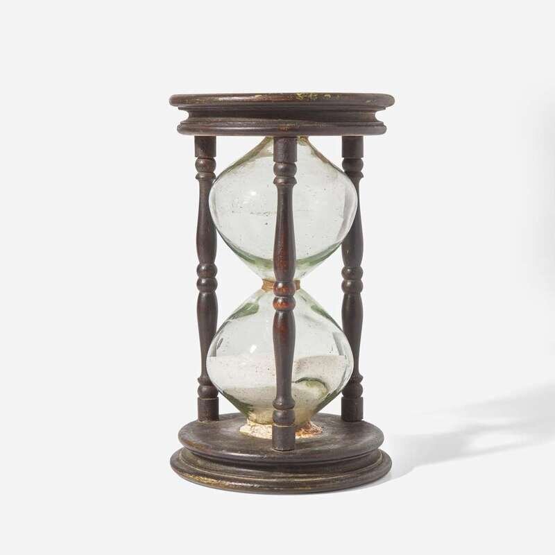 A rare large painted pine and blown glass sand timer or hour glass New England, 18th century