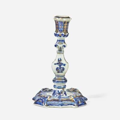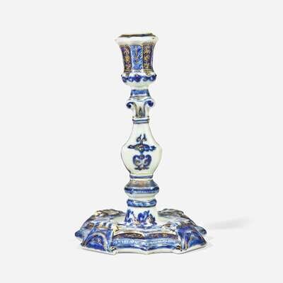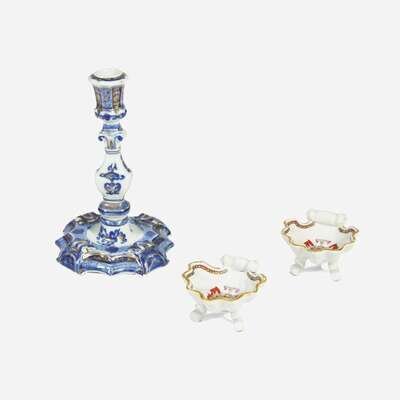 A Chinese Export porcelain blue and white candlestick with gilt decoration and pair of shell-form salts circa 1740-1755
