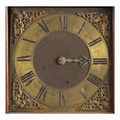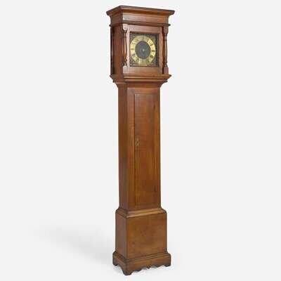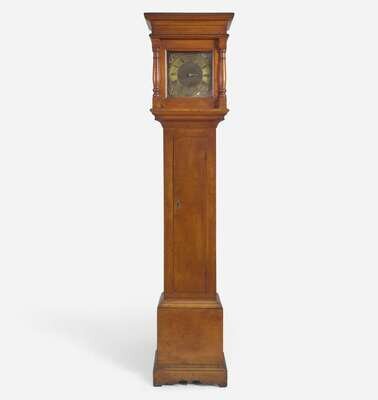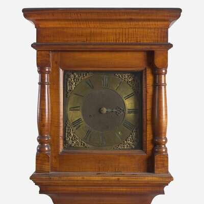 The hood with plain molded top, paneled door with turned engaged columns, brass face with engraved angels and applied brass spandrels with putti supporting crowns, with one hand, inscribed, "Tho. Crow," the case with molded top and plain rectangular case door, molded base on shaped bracket feet, 30 hour.