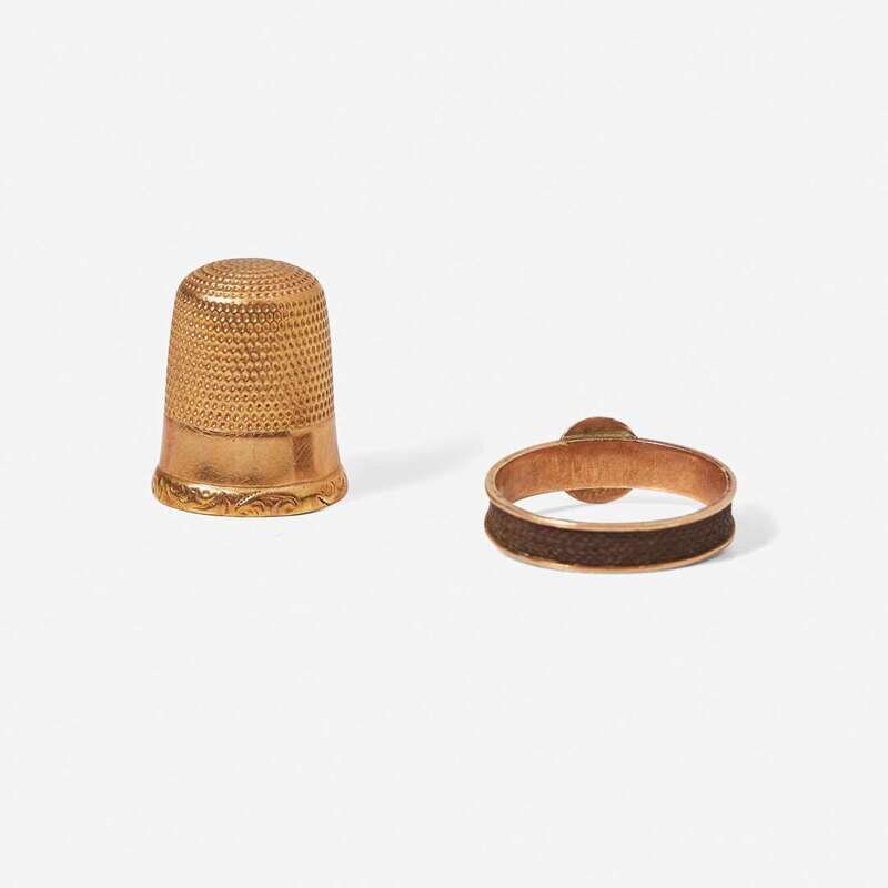 The rose gold band with woven hair and circular mount engraved with the initials "MSG," and gold thimble engraved, "M.G.S."