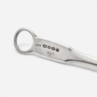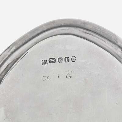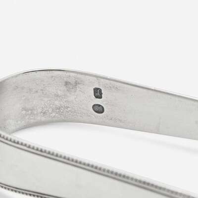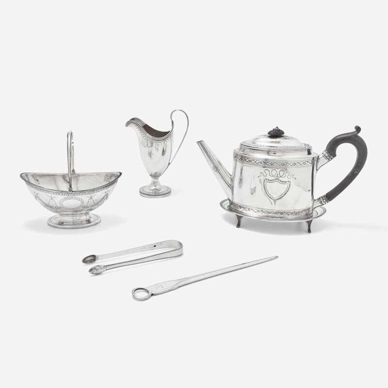 Comprising a teapot and stand, bearing conforming brightcut decoration including shield-form reserves, by Peter and Ann Bateman, London, 1792, both engraved with monogram to underside, "E.G"; a creamer with brightcut decoration including oval reserve with eagle crest, by Peter and Ann Bateman, London, 1793; a sugar basket with brightcut decoration including swagged laurel motifs flanking an oval reserve, by Soloman Hougham, London, 1789; a skewer engraved with armorial crest in the form of a helmeted man, by William Bateman I, London, 1824; and a sugar tongs, by Thomas Wallis II, circa 1790; all marked.