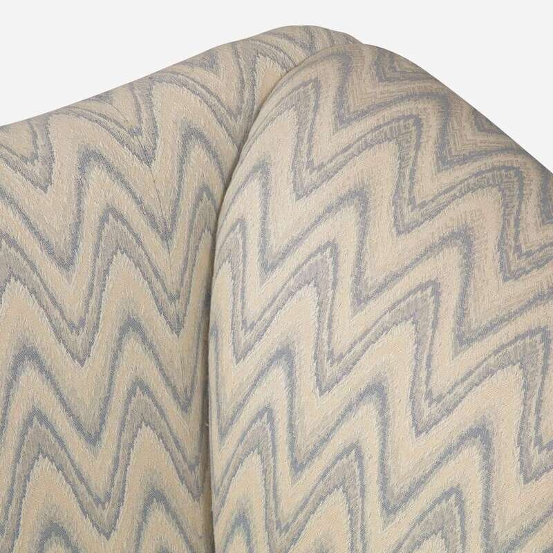 With arched back, scrolled arms, serpentine front, on H-form stretcher, with tapered and fluted front legs. Retains original linen under-upholstery.