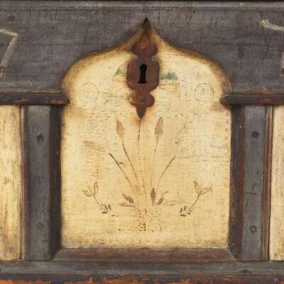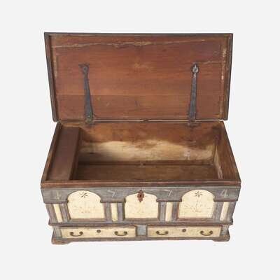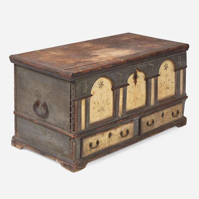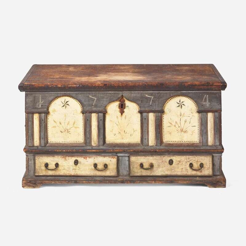 A painted and decorated architectural blanket chest Lancaster, Pennsylvania, dated "1774"