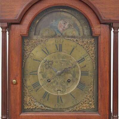 The brass arched face fitted with painted moon dial and engraved with scrolling leafage and tulips enclosing "Jacob Godshalk/Philadelphia."