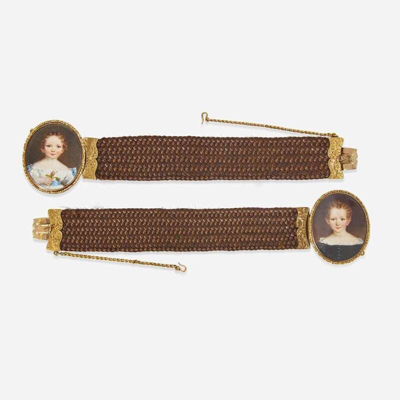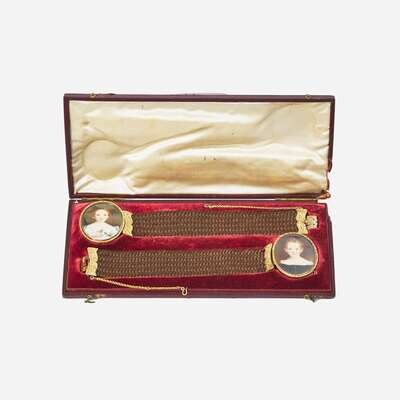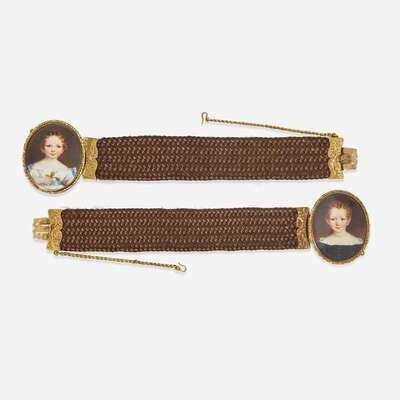 Attributed to William Egley (English, 1798-1878) A pair of hairwork bracelets with portrait miniatures of children, circa 1840