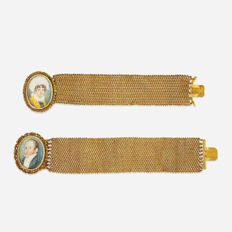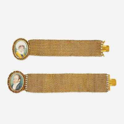 A pair of gilt bracelets fitted with portrait miniatures 19th century