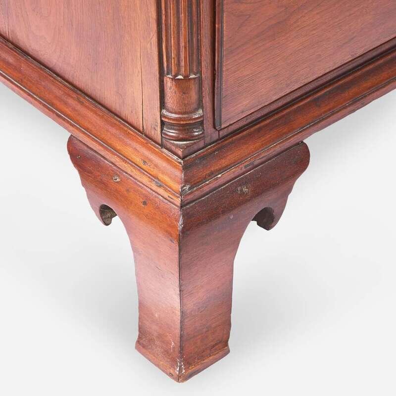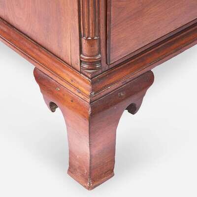 Flat molded cornice, over three short drawers over two short drawers over four graduated drawers, fluted quarter columns, molded base on tall shaped ogee feet.