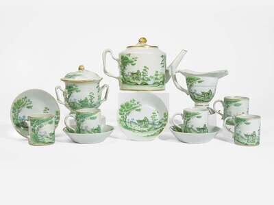 Very few pieces of Quaker Farmer in green enamel have survived; black, sepia and grisaille being the most common color enamels used with the pattern. It has been suggested, by the late dealer Elinor Gordon, and others that the ship carrying the unique green enamel Quaker Farmer service, ordered for the 1803 wedding of Elizabeth Jeffries (1783-1867) and Samuel Shipley (1777-1848), sank in the Delaware River and was salvaged some years later.