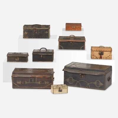 Overall comprising eight leather boxes and one hide covered box, most retaining original block-printed and marbled paper or ticking fabric, and original labels, to interior: one box with studded monogram to lid, "RCB," with label, "By Thomas Moyer, No. 26, Market Street, Philadelphia," a box with label, "W.S. Hansell, No. 24, Southside of Market street, near Front street, Philadelphia," one box with label, "Andrew Riley, No. 19, Hanover Street, Boston," one box with label, "Robert Burr, Trunk Manufacturer, No. 9 Hanover Street (Nearly opposite the Shawmut House, Boston.)," one box with label, "E.A.G. Roulstone, Successor to Robert Burr...9 Hanover St...Boston.," one box with label, "Thomas Moyer, No. 38 Market Street, Philadelphia," one box with brass plaque to lid engraved, "Boston Copper Co." and with label, "George Domett...6 Dock Square, Boston.," and bearing inscription to underside, "Boston & Braintree Copper & Brass Manufactory, Boston," one box with no label but bearing pencil inscriptions to interior of lid, "Ebenezer C. Andrews/ Otisfield Maine/ July 10th 1847/ Bought of Moses D. Andrews/ Five years ago/ M.D. Andrews Esq/ Otisfield Maine/ Robert And [in ink] Robert Andrews," and one box with no label.