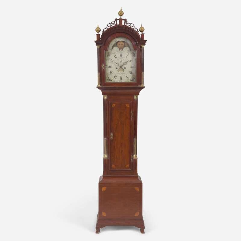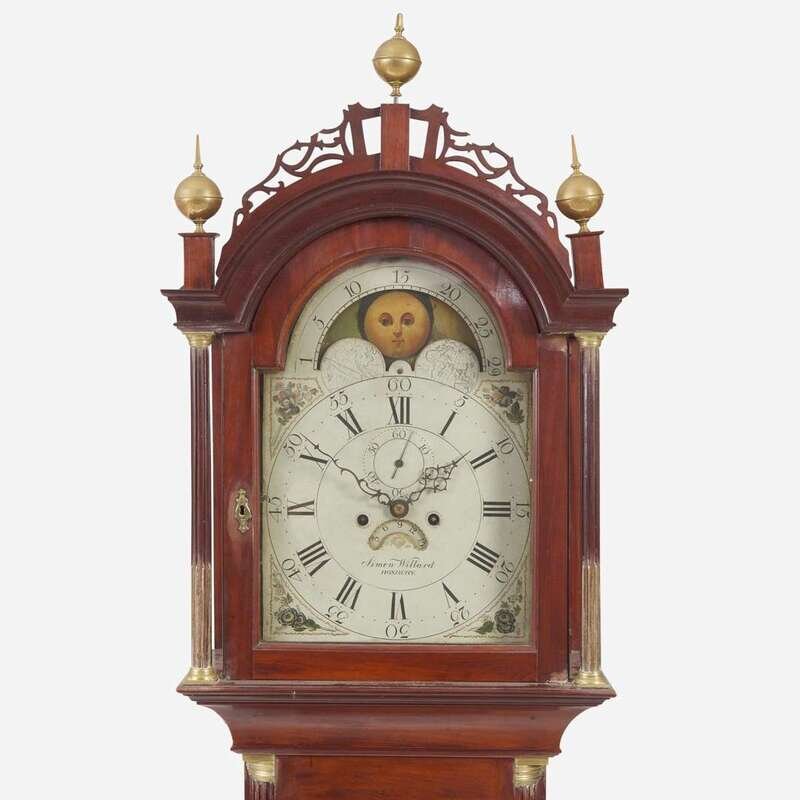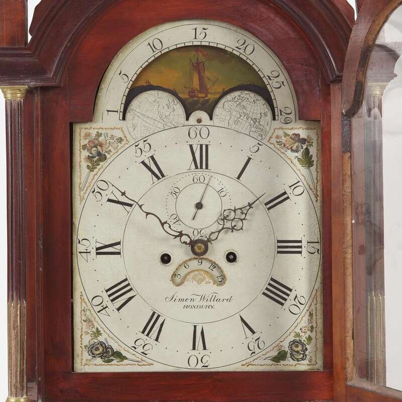 With arched hood having carved fret top, three ball and steeple brass finials, enamel face with floral motifs to spandrels and moon dial, inscribed "Simon Willard/ Roxbury," the case with line and quarter fan inlay, fluted quarter columns with brass capitals and stop-fluting, molded base on ogee feet.