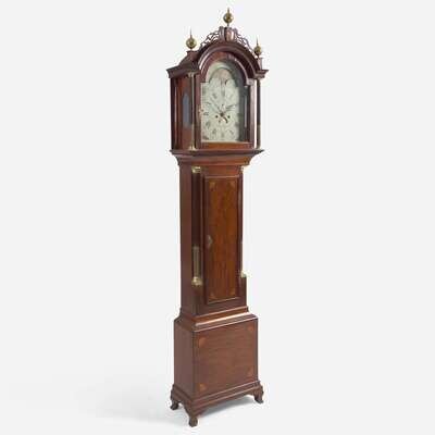 A Federal inlaid mahogany tall case clock Works by Simon Willard (1753-1848), Roxbury, MA, the case possibly by Stephen Badlam (1751-1815), Dorchester, MA, circa 1795