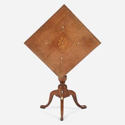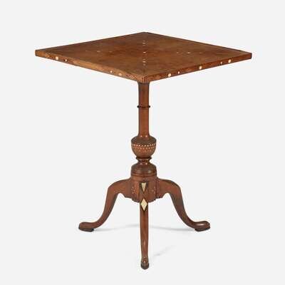 Decorated with geometric bone and fruitwood inlays, three diamond-shaped inlays on top inscribed with initials, "ALW," square top on baluster support, three cabriole legs ending in pad feet.