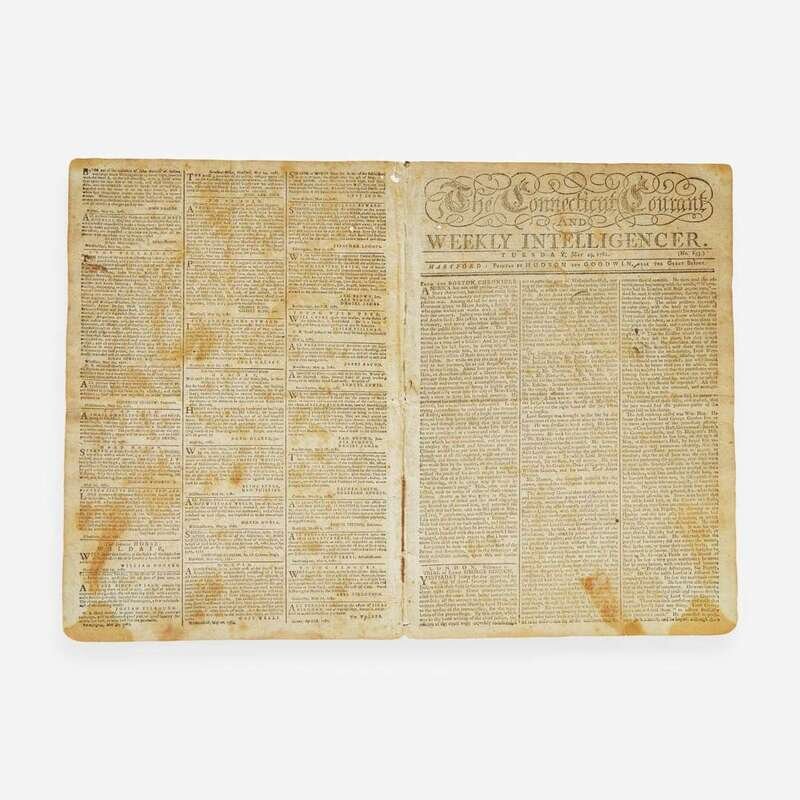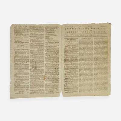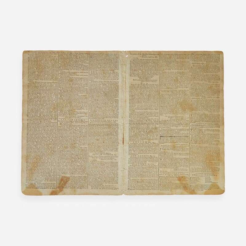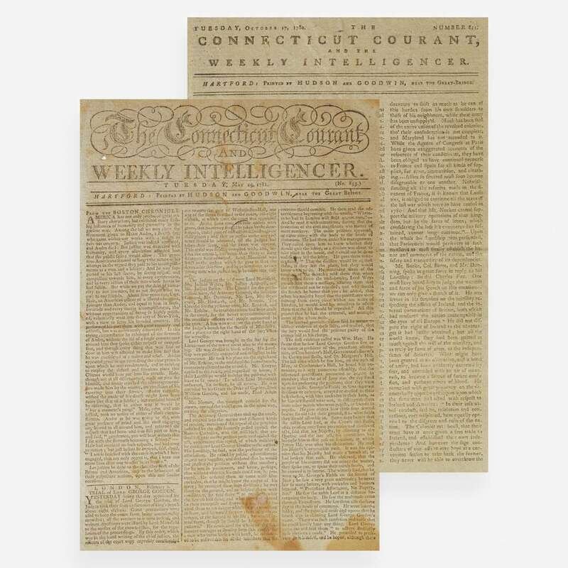 Hartford: Printed by Hudson and Goodwin, Tuesday, May 29, 1781. No. 853. Bifolium leaf, 13 3/4 x 9 11/16 in. (349 x 246 mm). Printed newspaper in three columns. Disbound; a few small holes and open tears at top center edge; sheet toned with scattered foxing.