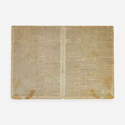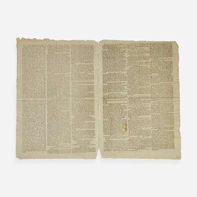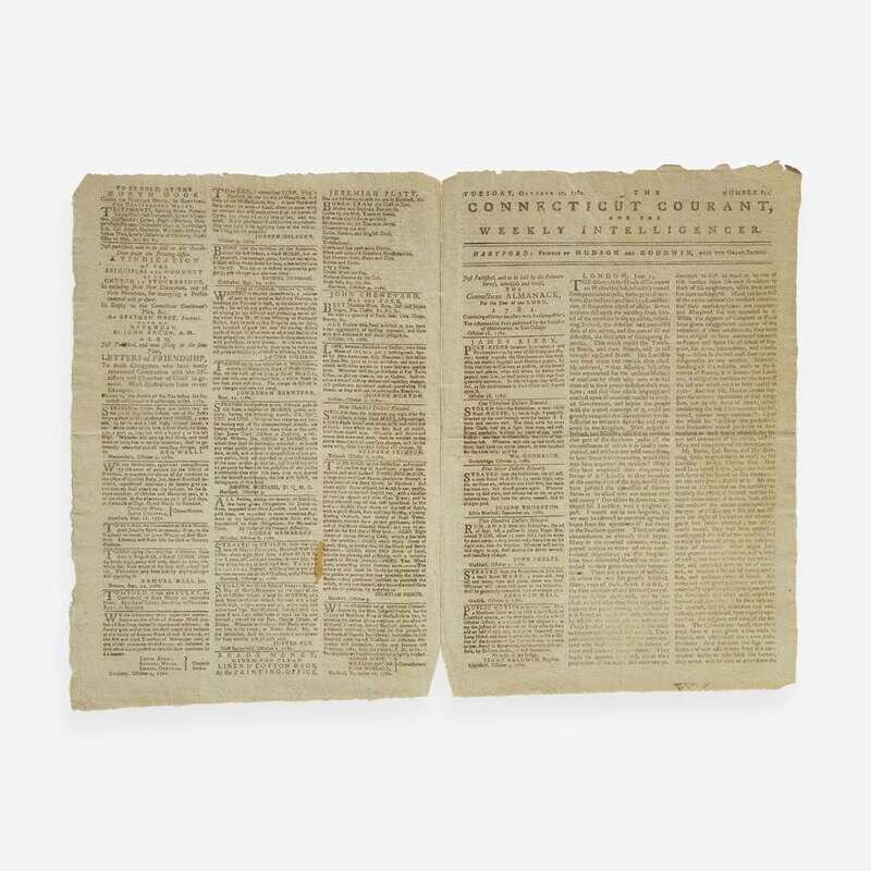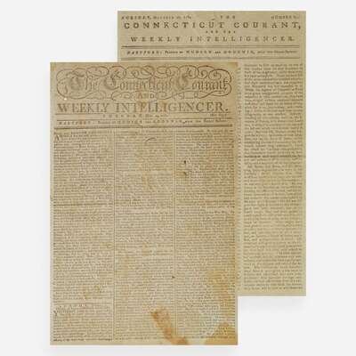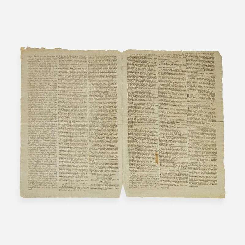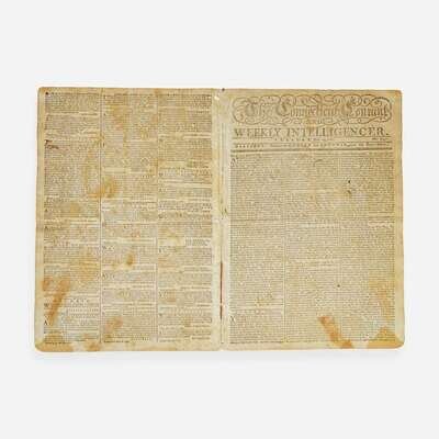 Hartford: Printed by Hudson and Goodwin, Tuesday, October 17, 1780. Number 821. Bifolium leaf, 14 1/4 x 9 7/8 in. (362 x 251 mm). Printed newspaper in three columns. Untrimmed; separated along center fold; small stain in bottom second leaf.