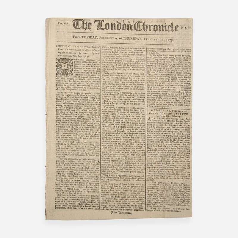 London: Sold by J. Wilkie, February 9-11, 1779. No. 3462, Vol. XLV. 8 pp., 11 x 8 in. (279 x 203 mm). Printed newspaper in three columns. Disbound; edges trimmed; British halfpenny tax stamp on fourth page.