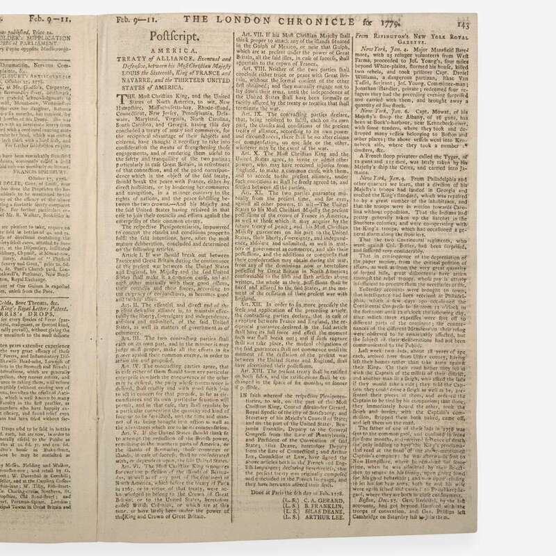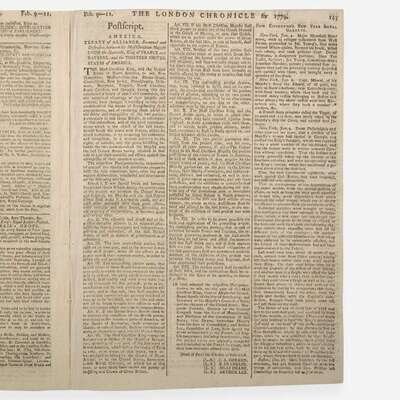 An early British printing of the February 6, 1778 Treaty of Alliance between the United States and France, reproduced in full as a postscript to this issue. The first page of the Chronicle features an excerpt from Sir William Pulteney's Considerations on the present State of Public Affairs, and the Means of raising the Necessary Supplies. He reflects on events of the past year and discusses the Continental Congress's recent rejection of the Conciliatory Bill and the ratification of the Treaty of Alliance between the United States and France. He argues that Great Britain should continue in their brave fighting, or accept the loss of their colonies.