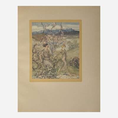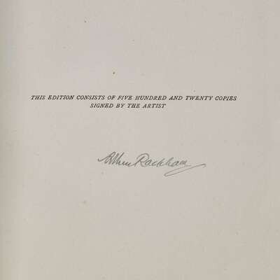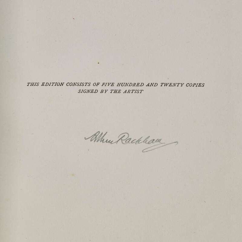 London: Macmillan & Co. Ltd., 1920. First and limited edition, one of 520 unnumbered copies, signed by Rackham. 4to. (xii), (318). Illustrated with color frontispiece and 15 color plates, all mounted and all with captioned tissue guards, and numerous in-text black and white illustrations. Publisher's quarter vellum over cream paper-covered boards, decorated in gilt, front board unevenly toned; top edge gilt, other edges untrimmed; prelims foxed and with offsetting; some pages unopened; in original white dust-jacket, tattered and soiled; Latimore and Haskell, pp. 52-53; Riall, p. 138