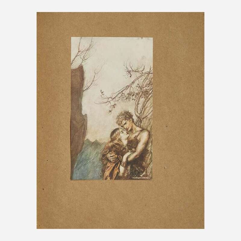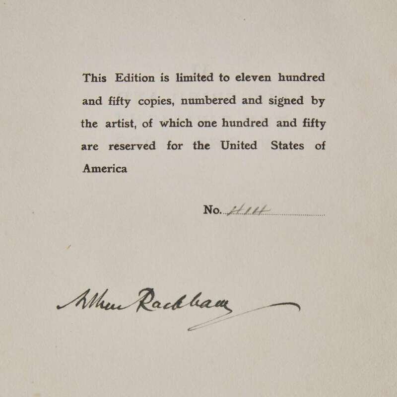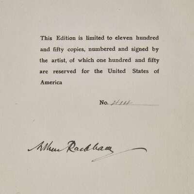 London: William Heinemann/New York: Doubleday, Page & Co., 1911. First and limited edition, #414/1,150 numbered copies, signed by Rackham. 4to. (xii), (182, (1) pp. Illustrated with color frontispiece and 29 color plates, all mounted and all with captioned tissue guards, and numerous in-text black and white illustrations. Translated from the German by Margaret Armour. Publisher's deluxe full vellum, decorated in gilt; top edge gilt, other edges untrimmed; text and binding variously foxed, discolored and toned; silk ties wanting; Latimore & Haskell, pp. 37-38; Riall p. 109