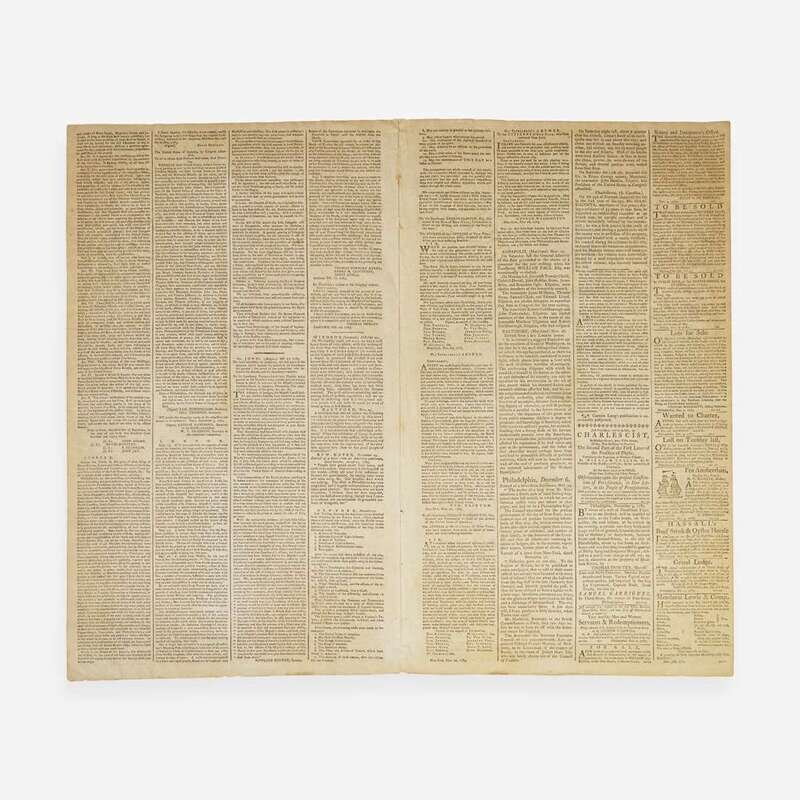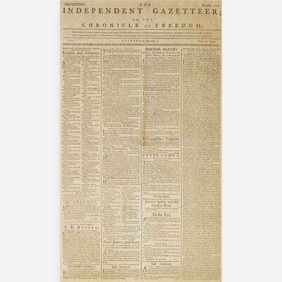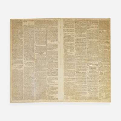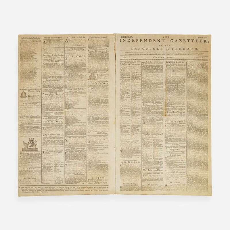 Philadelphia: Printed by E. Oswald, and D. Humphreys, Saturday, December 6, 1783. Numb. 110. Bifolium leaf, 18 1/4 x 11 in. (463 x 279 mm). Printed newspaper in four columns. Disbound; creasing from old folds; scattered light foxing.