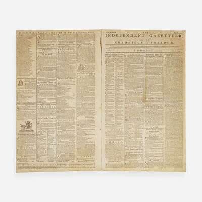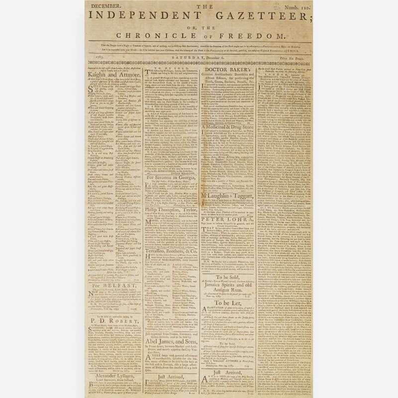 An early American newspaper with a front page printing of the Definitive Treaty of Paris, officially ending the American Revolution with Great Britain's recognition of the United States as, "Free, Sovereign, and Independent". The ten articles of the treaty are printed in full on the first and second pages, and is signed in type by the American negotiators, John Adams, Benjamin Franklin, and John Jay, as well as British negotiator, David Hartley.
