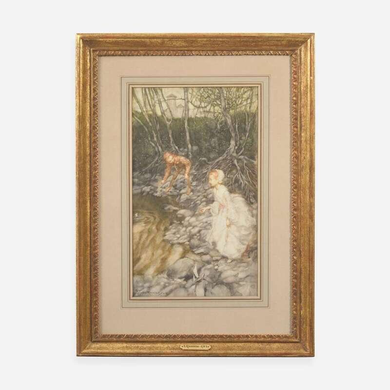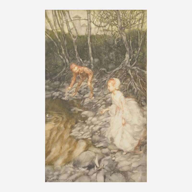 No place (but likely London), ca. 1904. Original unpublished watercolor illustration on board, signed and dated 1904 by Rackham lower left. 14 1/4 x 8 1/4 in. (362 x 210 mm). A brightly lit woodland scene with two children at the water's edge, holding strings tied to paper boats. Mounted to mat, moderate mat burn to margins; in frame, 22 x 16 in. (569 x 406 mm).