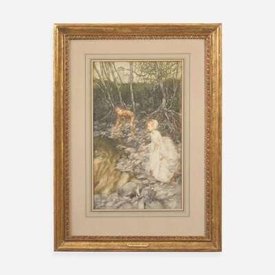 A supplement from Chas. J. Sawyer Catalogue No. 305, Spring 1980, describes this work as, "A superb and delicately executed watercolor depicting a young girl dressed in Victorian bonnet and gown and an elfin sprite both perching on the stony banks of a pool, in which they are sailing toy boats. Characteristic gnarled trees form a partial screen between the figures and a castle of rotunda towers in the background...This watercolor was never intended for publication and is remarkable in the fact that Rackham has entirely limited himself to watercolor and brush and has used no pen and ink. It is this that gives the picture its delicate quality which is sometimes lacking in his book illustrations."