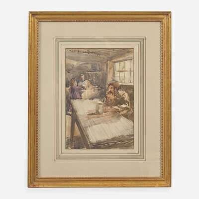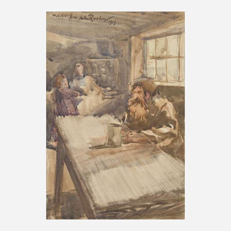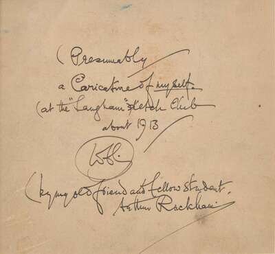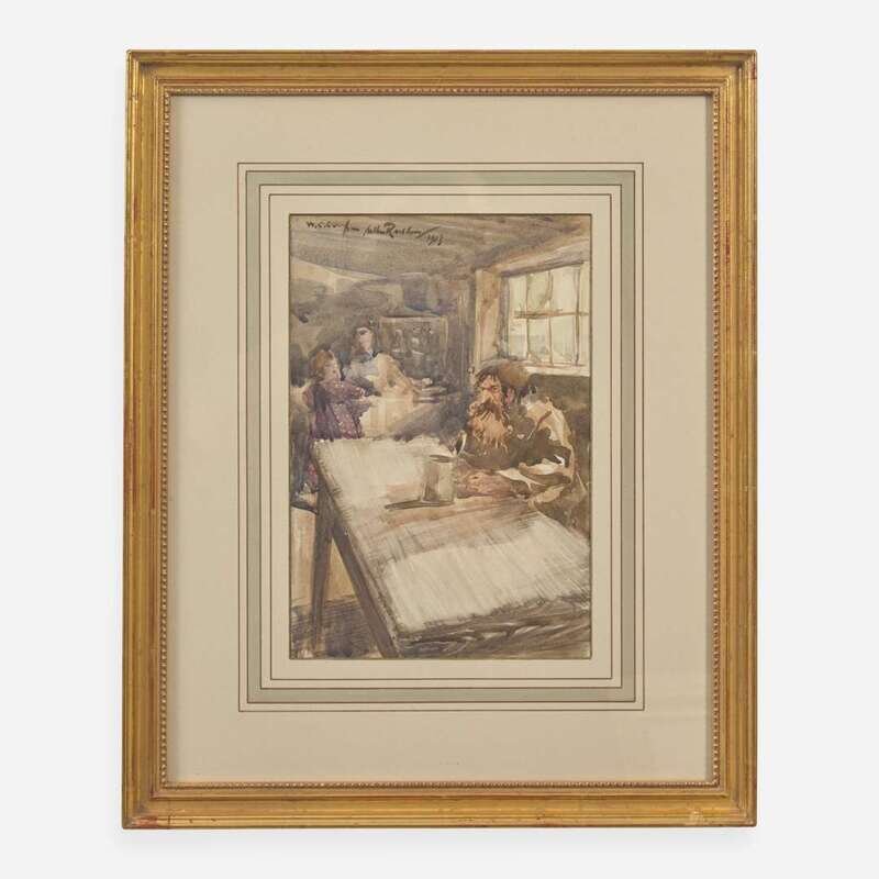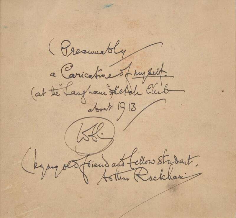 No place (but likely London), 1913. Original watercolor illustration on board, signed by Arthur Rackham, top right: "W.C.C. from Arthur Rackham/1913." 10 1/2 x 7 1/4 in. (267 x 184 mm). Rackham has painted his friend, colleague, and fellow artist William Cubitt Cooke, at the Langham Sketch Club in London. Cooke writes on the verso, "Presumably a Caricature of myself at the 'Langham' Sketch Club about 1913/WCC/by my old friend and fellow student, Arthur Rackham." In mat and in frame, 18 1/4 x 15 in. (210 x 381 mm).