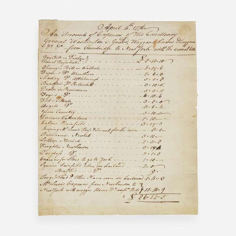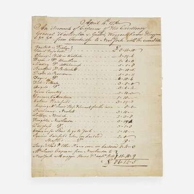 No place, ca. April, 1776. One sheet, 9 3/16 x 7 1/2 in. (233 x 190 mm). Manuscript document in a secretarial hand, being "April 4th 1776--An Account of Expences of His Excellency General Washington v. Guard, Waggons, horses, & Waggoners, &c &c from Cambridge to New York--with the several bills"; listing 24 expenses incurred by Washington and his men along the way, with the amount of money spent at each location, listing each town, vendor names, taverns, etc., totaling "£86..14..5." Creasing from old folds; trimmed along edges, with scattered small chipping; remnants from previous mounting in top corners and along left edge verso.