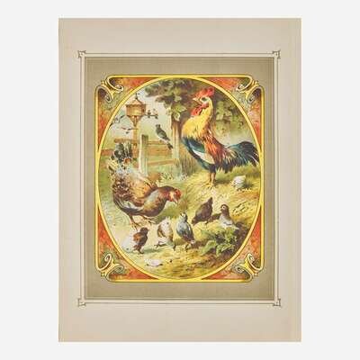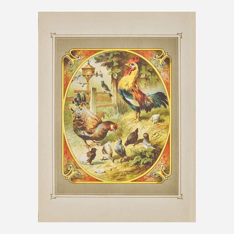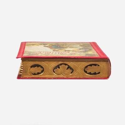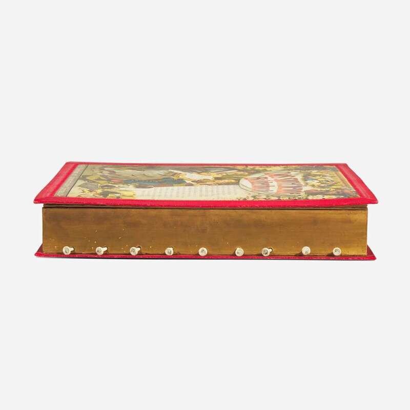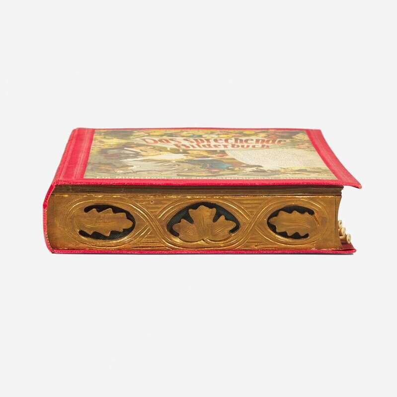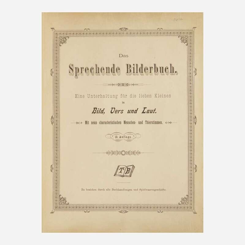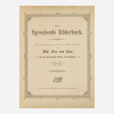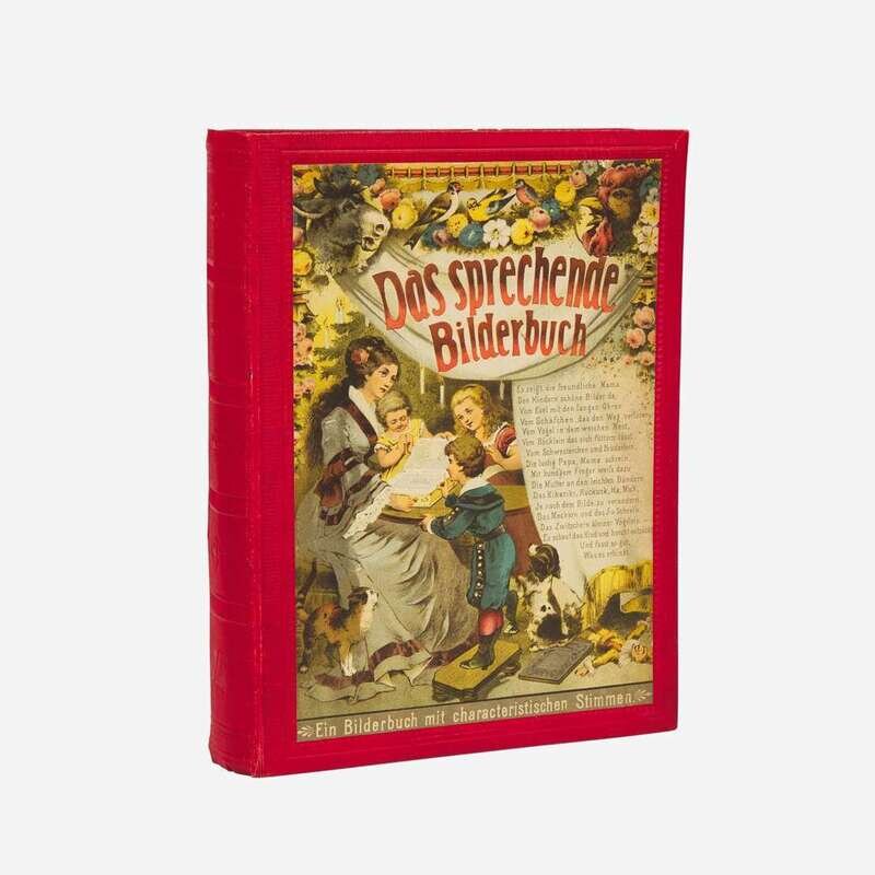 (Sonnenberg, Germany, ca. 1900). 10th Edition. Folio. An endlessly entertaining speaking picture book, illustrated with eight chromolithographs of various barnyard animals, including birds, a cow, donkey, lamb, etc.; each with accompanying printed text, and with nine original corresponding pull tabs, that when activated recreate the sound of the animal. Publisher's red cloth-covered wooden box in the shape of a book, large chromolithographic cover label; all edges gilt, top and bottom edges with carved foliated sound vents.