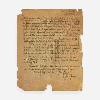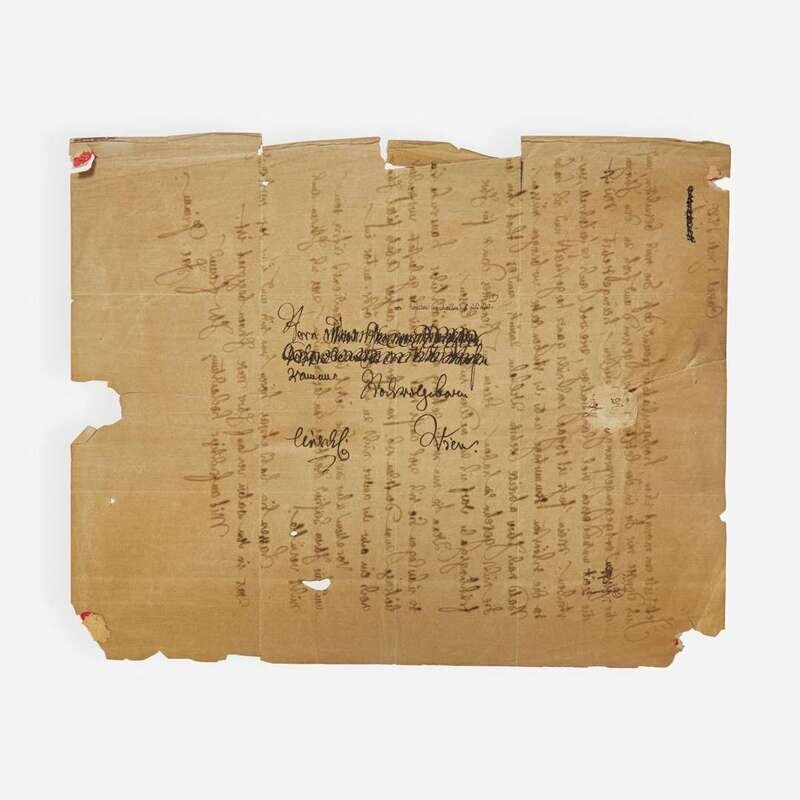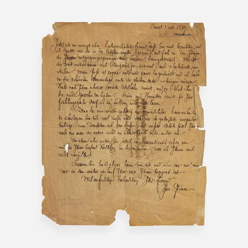 Cassel, Germany, July 1, 1839. One sheet, 10 7/16 x 8 3/8 in. (265 x 213 mm). Autograph letter in German, signed by Jacob Grimm to an unknown recipient in Vienna: “It’s now been a month already, my esteemed friend, since you visited us,” and continues that he is in good health, and also “taking the time to eat a lot, both leisurely and lightning fast.” He adds that “you had brought the loveliest summer days under your most congenial watch," and makes a brief comment on his brother Wilhelm--with whom he had begun compiling their monumental dictionary of the German language--and asks that his friend “please give thanks to B_____ for his spring gift.” He also appears to reference the former German publisher Johann Martin Abele, associated with the University of Göttingen, as well as his thoughts on authorship. In the penultimate paragraph, Grimm jokingly states, “Above all, as you are now in the service of women…” (Grimm uses "Frauendienst,” a reference to the history of courtly lyric and narrative genres), and alludes to the early medieval Austrian poet Siefried Helbling--who specialized in satirical, instructional dialogues between himself and his female servant--whose work Grimm begrudged for many years. Grimm closes by asking,“Let me hear from you about what has happened in the course of this last year's journey,” and “With sincere respects, your friend, Jac. Grimm."; addressed on verso in Grimm's hand, partially crossed out, presumably by him; additionally inscribed in another hand to same, "Received copy 8 July 1839." Creasing from contemporary and fragile folds; chipping and creasing along edges; 3 1/2 in. closed tear vertically traversing bottom of sheet.