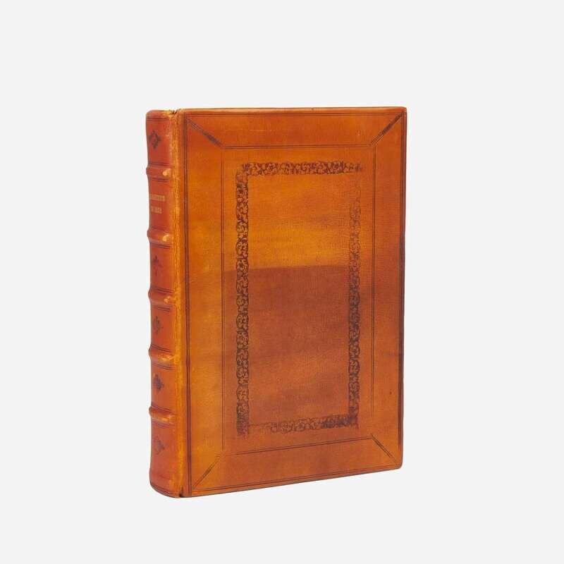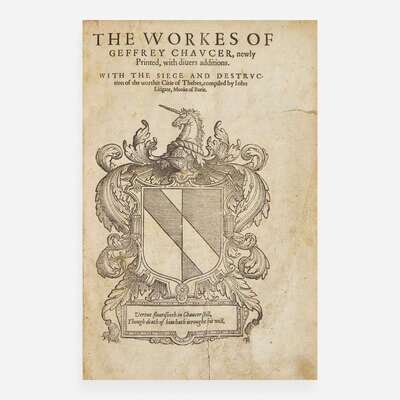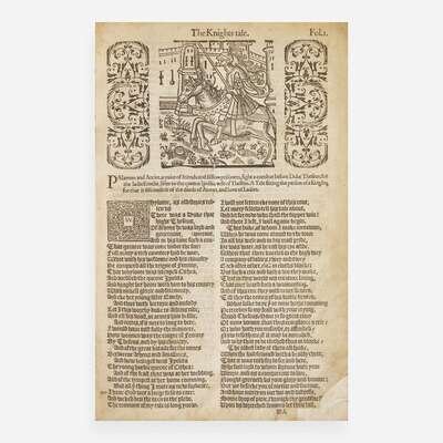 (London: Printed by Adam Islip, 1602). Second Thomas Speght edition (seventh edition overall). Folio. (viii), 351, 353-376, 11 leaves. Lacking 20 leaves: engraved portrait of Chaucer (a1); general title-page (a2); 13 preliminary leaves (a3-c3); second page of Thynne's letter to Henry VIII (c6); Fol. 18; final three leaves at rear. Edited by Thomas Speght and Francis Thynne. Printed in two columns, black letter; running headlines and foliation in Roman type. Illustrated with woodcut Chaucer coat of arms (reprinted version from the variant 1561 edition); woodcut for "The Knight's tale" (B1), and woodcut borders, head- and tail-pieces, and decorated initials. Full modern tan paneled calf, stamped in blind and in gilt; speckled red edges; coat of arms leaf worn and soiled with some loss in bottom corner, repaired on verso; edges and corners of preliminary leaves worn with scattered repairs, affecting some words; edges trimmed close, touching some catchwords, running headlines, and printed manicules in margins; bottom half of Fol. 190 torn away; open tear in center Fol. 210; bottom corner of Fol. 306 torn away, affecting some words; scattered spotting and creasing to text; repairs and wear along edges of final ten leaves; scattered marginalia; contemporary ownership signature at foot of verso of p. 375; two 18th century ownership signatures along fore-edge of Fol. 175 verso; (presumably) ink scrawl in gutter of Fol. 157 and 158, with some lacing and bleeding into adjacent pages. Hammond p. 125-127; ESTC S107210