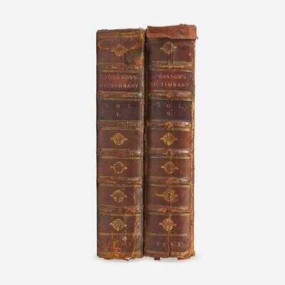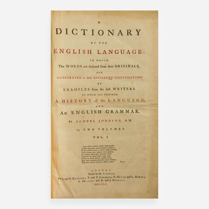 First edition of Johnson's magnum opus, often considered one of the greatest works in the English language. "Dr. Johnson performed with his Dictionary the most amazing, enduring and endearing one-man feat in the field of lexicography...it took Johnson less than ten years from writing his first prospectus in 1746 to publication day, 14 June 1755...Johnson's Dictionary is divided into four parts: the preface, in which he expounds--largely in the steps of Ephraim Chambers--the aims and problems of lexicography; a history and a grammar of the English language...and finally the dictionary proper...Johnson introduced into English lexicography principles which had already been accepted in Europe but were quite novel in mid-eighteenth-century England. He codified the spelling of English words; he gave full and lucid definitions of their meanings (often entertainingly coloured by his High Church and Tory propensities); and he adduced extensive and apt illustrations from a wide range of authoritative writers." (John Carter, Printing and the Mind of Man, pp. 121)