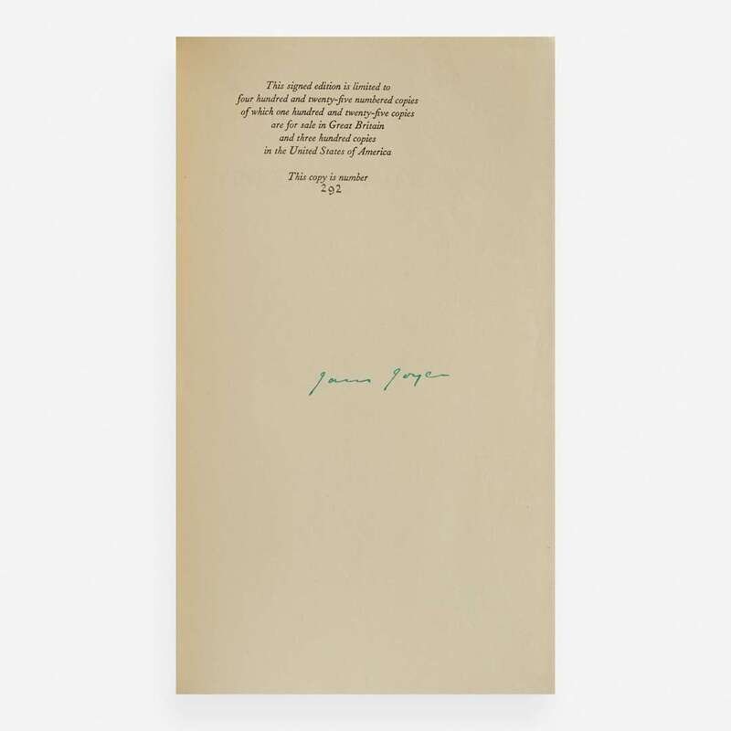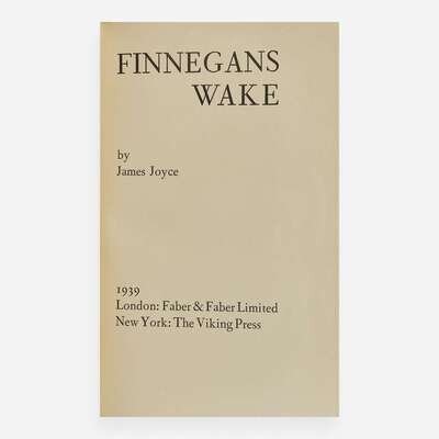 London: Faber & Faber Limited/New York: The Viking Press, 1939. First and limited edition, #292/425 numbered copies, signed by Joyce in green ink. Tall 8vo. (viii), 628 pp. Publisher's full brick red cloth, stamped in gilt, spine lightly faded; top edge gilt, other edges untrimmed; text partially unopened; in original yellow cloth slip case, soiled and moderately worn. Slocum & Cahoon 49