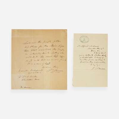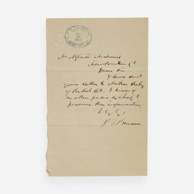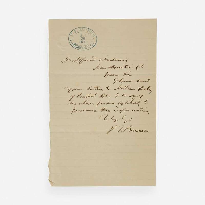 Bridgeport, Connecticut, July 29, 1871. One sheet, 7 x 4 1/2 in. (178 x 114 mm). Autograph letter, signed by Barnum, to Alfred Andrews of New Britain, Connecticut: "Dear Sir I have sent your letter to Nathan Seeley of Bethel Ct. I know of no other person as likely to procure the information...P.T. Barnum"; with Barnum dated ink stamp at top; creasing from old folds.
