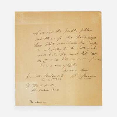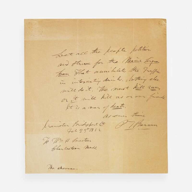 Bridgeport, Connecticut: Iranistan, Feb(ruary) 23, 1852. One sheet, 7 7/8 x 7 3/8 in. (200 x 187 mm). Autograph letter on Barnum's personal embossed stationery, to William H. Sweetser of Charlestown, Massachusetts: "Let all the people petition and strive for the Maine Liquor Law. That annihilates the Traffic in intoxicating drinks. Nothing else will do it. We must kill rum, or it will kill us or our friends. It is a mean of death...PT Barnum"; annotated in another hand at bottom, "The showman." Creasing from old folds; unevenly toned; wear in top corners from previous mount.