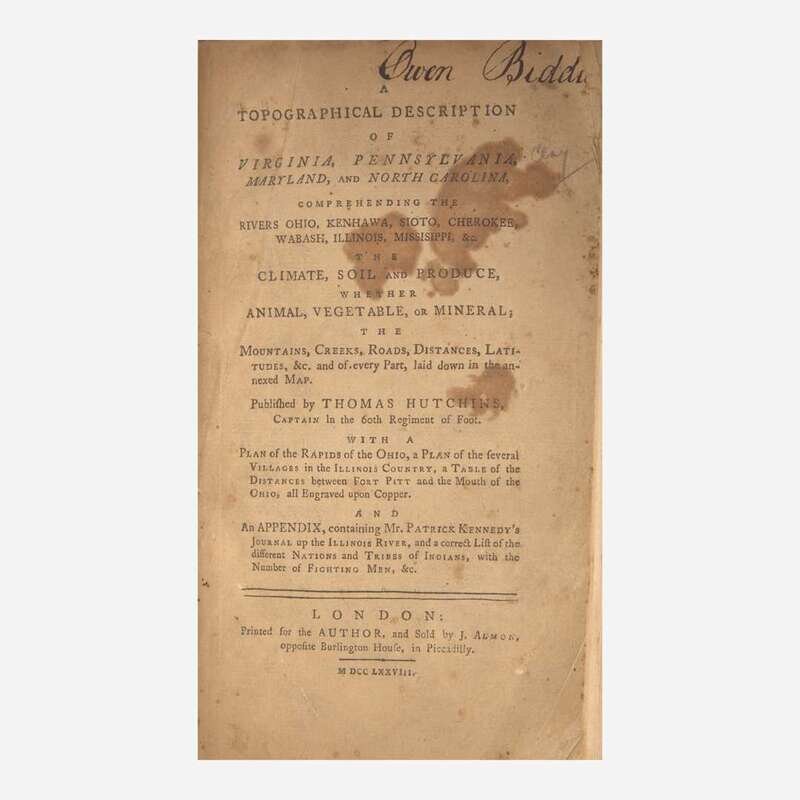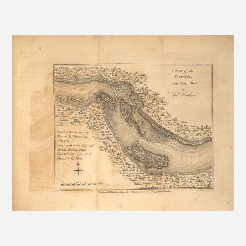 A valuable and descriptive source on the western country in North America during the late British period, written by the first and only official geographer of the United States, Thomas Hutchins. "Hutchins served with considerable distinction during the period of the French and Indian War, and under Colonel Bouqet at Fort Pitt, the plan of which he laid out. He was later engaged with Captain Harry Gordon in a survey of the country bordering the Ohio and Mississippi from Pittsburgh to New Orleans, and there is little doubt, that much of the information given in the above work was gleaned during that adventurous voyage. He afterwards went to England where he got into serious trouble with the British Government for holding a supposed correspondence with Benjamin Franklin, who was then acting as American Ambassador at the Court of France. Returning to America, via France, he joined the Southern Army under General (Nathanael) Green (sic), and on the close of the war he was appointed Geographer General to the United States, which position he had until his death which took place at Pittsburgh, April 28, 1789." (Soliday IV, p. 38).
