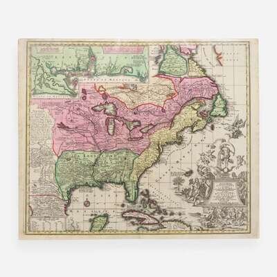 (Augsburg, ca. 1730s). Engraved hand-colored map of eastern North America, with a focus on the Mississippi River and Great Lakes regions, with an inset view at top of the mouth of the Mississippi River and Gulf Coast; 20 5/16 x 24 1/4 in. (516 x 616 mm). In mat, 24 3/4 x 27 7/8 in. (629 x 708 mm).