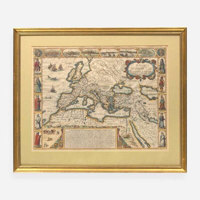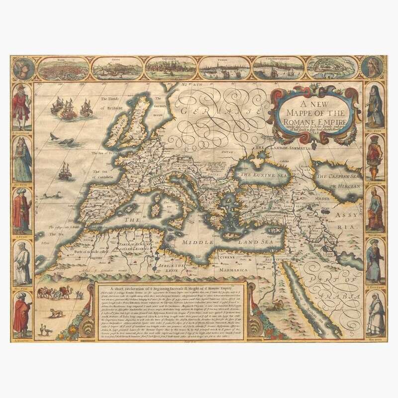 A handsome copy of John Speed's map of the Roman Empire, encompassing the lower half of Europe, the British Isles, parts of North Africa and the Middle East, and Germania labeled at top. With three decorative borders, including bird's eye views of Rome, Geneva, Jerusalem, Venice, Constantinople, and Alexandria, and two side borders depicting Roman dress.