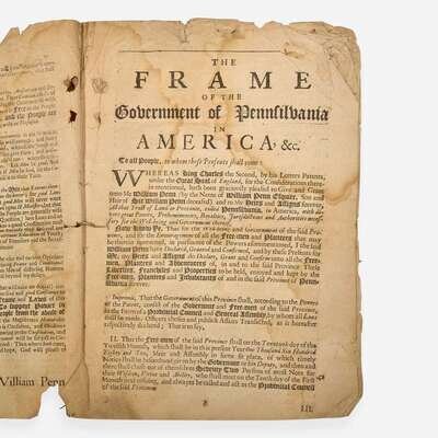 A significant document pertaining to the early history of Pennsylvania: William Penn's first proposed Pennsylvania constitution of 1682. Published just four months before Penn's first trip to his newly chartered colony, this document delineates the proposed structure for Pennsylvania's government. It also outlines many features that made his "Holy Experiment" unique at the time, including liberty of conscience, religious toleration, freedom of speech and dissent, and freedom from cruel and unusual punishment. As Penn writes in his preamble, this Frame was devised "to support Power in Reverence with the People, And to secure the People from the abuse of Power; that they may be free by their just Obedience, and the Magistrates Honourable for their just Administration: For Liberty without Obedience is Confusion, and Obedience without Liberty is Slavery." The Frame called for a bicameral legislature composed of an upper house of up to 72 members--the Provincial Council--and a lower house made up of no more than 200 members--the General Assembly. It also created the position of Governor--to be occupied by Penn, and then his heirs--who would have three votes on the Council, as well as the ability to veto legislation. Of the two houses, the Council was imparted with significantly more powers, such as the ability to propose all legislation, erect courts, situate cities and ports, execute laws, and supervise the treasury, among other things. In comparison, the General Assembly was restricted to confirming or denying laws proposed by the Governor or Council. The final section, "Laws Agreed Upon in England" is a series of 40 statutes regarding voting rights, taxation, the judicial system, education, religious toleration, and prescriptions of allowed behavior and morals.