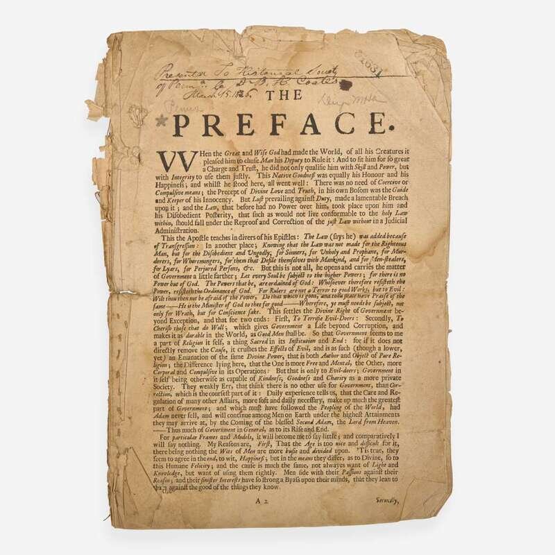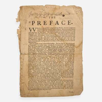 (London: William Bradford, 1682). First edition. Small folio. 7 (of 8) leaves; lacking title-page. Small remnant of original wrapper remains, original thread largely intact; gift inscription at top of first leaf, "Presented To Historical Society / of Penna. by Dr. B. A. Coates / March 15, 1826"; two later pencil notations below same, one being "Dup MHA"; library number ink-stamped at top of first leaf; all leaves worn and soiled; dampstaining along upper and fore-edges of all leaves; top and bottom corners creased; horizontal crease along center of leaves, with open tears to same in D2, affecting some words; top and bottom edges variously chipped, touching letters in rear leaves; final two leaves very worn, with D2 partially adhered to final blank; upper inner portion of final leaf separated. Duplicate copy, deaccessioned from the Historical Society of Pennsylvania. Church 676; Sabin 59696; Streeter 11-941; ESTC R18855